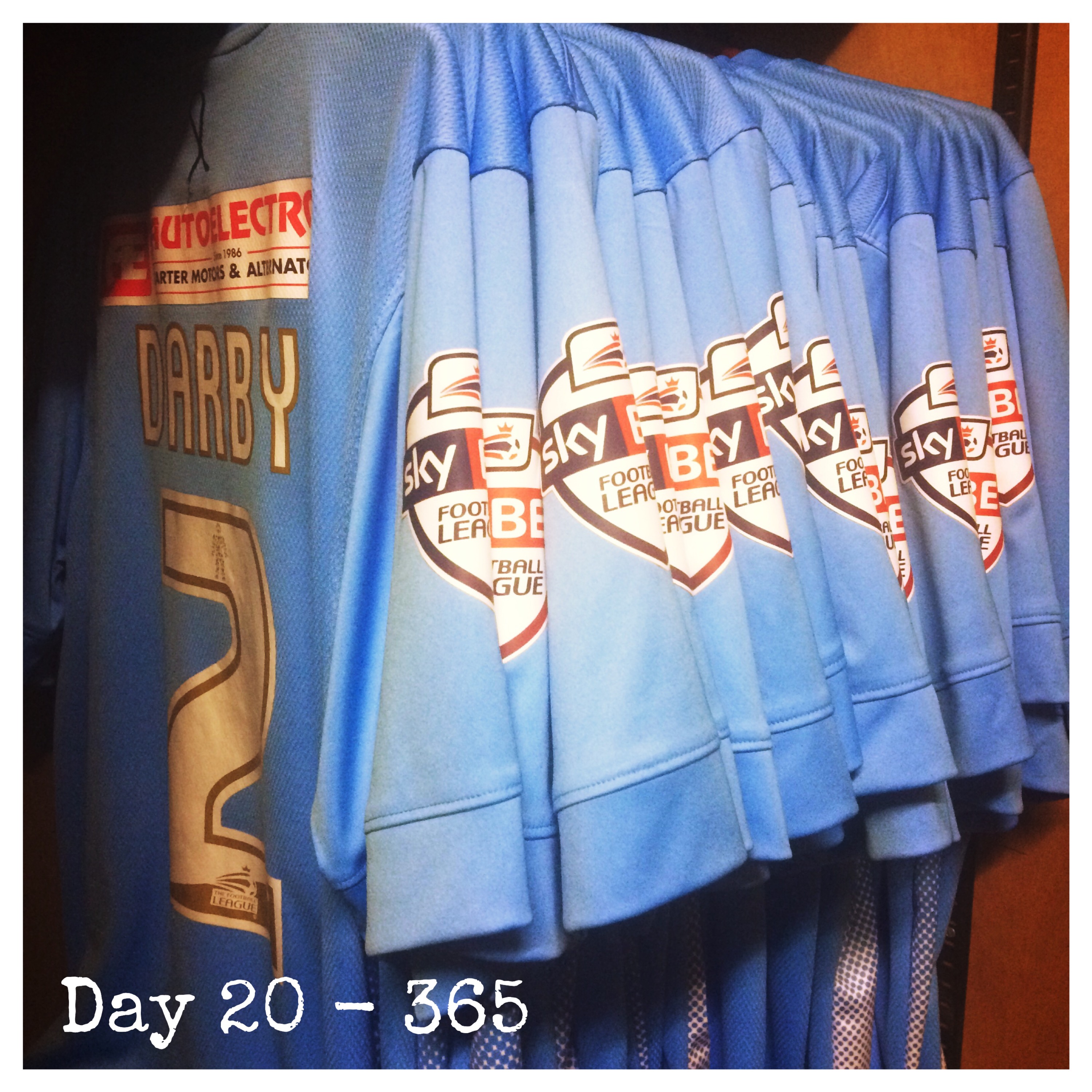 Of course, they are Bradford City FC away shirts; actual player shirts too, complete with the Football League badges and the player names and numbers. I took this picture today in the kit room at Valley Parade. I was at the ground to collect my tickets for Saturday’s game against Chelsea and was, along with a friend, lucky enough to be able to spend five or ten minutes in the company of the club’s kit man. He very kindly suggested I take a picture for my 365 project.