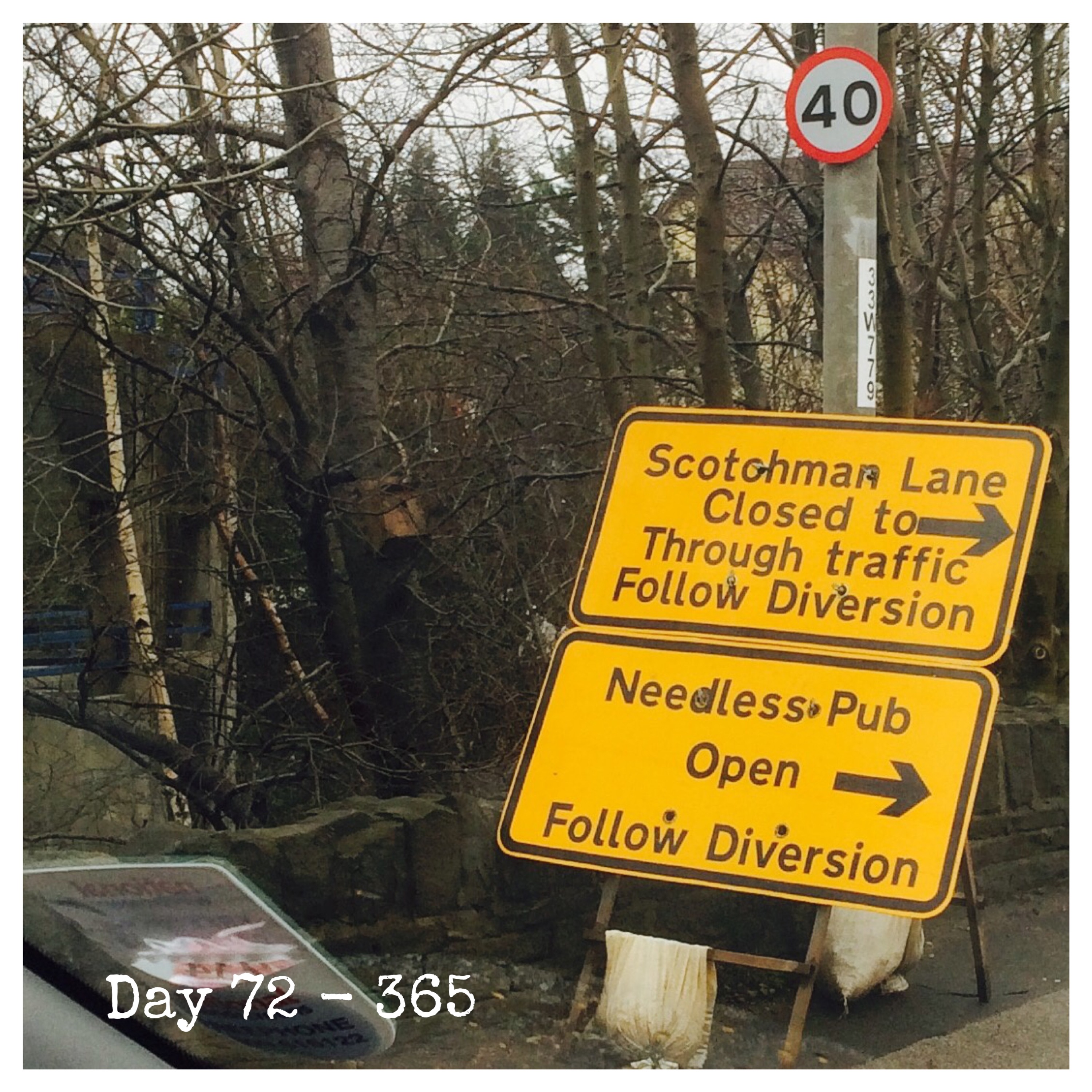 I was stopped in a queue of traffic at a a lighted junction and saw this road sign. I just loved the fact that the “Needless Pub” is open.