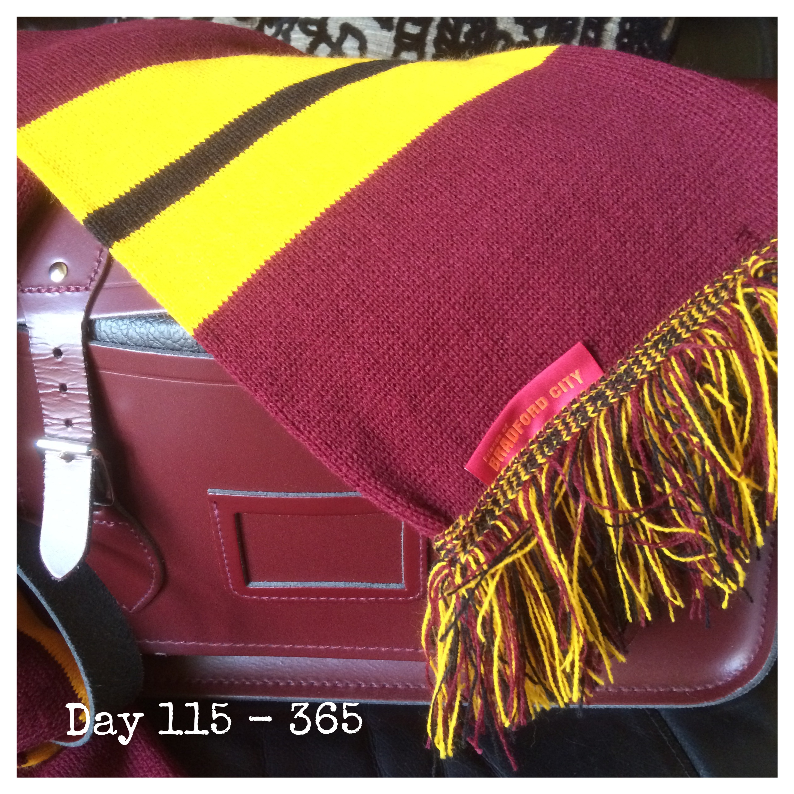 Today, the final home game of the season, sees our club pay it respects to those lost on 11th May 1985. For 30 years Bradford City has held a quite and dignified tribute to the 56 fans who did not return from Valley Parade. I was meeting Jeremy about the caps before the match and used my claret satchel to carry my documents and bibs and bobs. The scarf is a new one, especially created to raise funds for the Bradford Burns Unit.