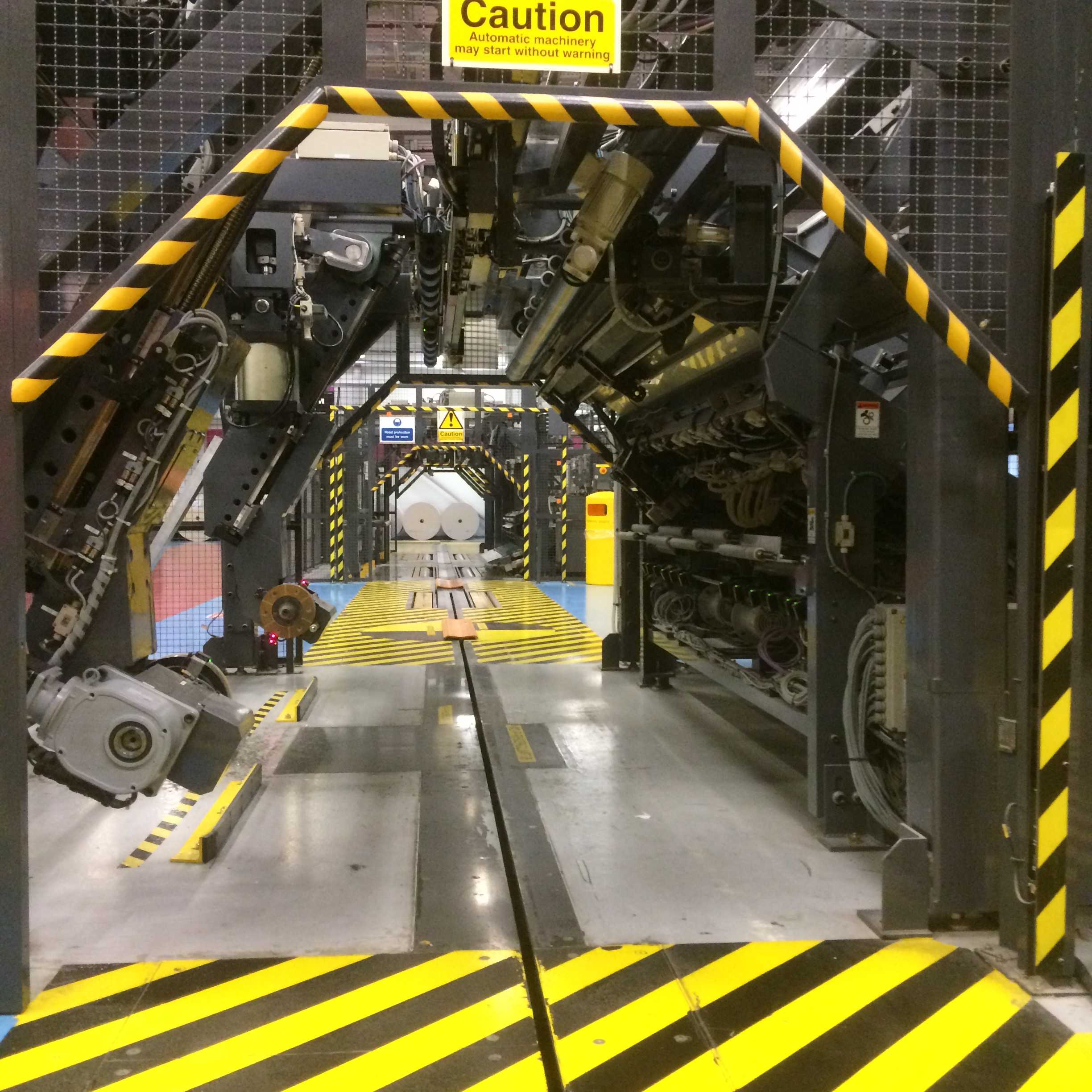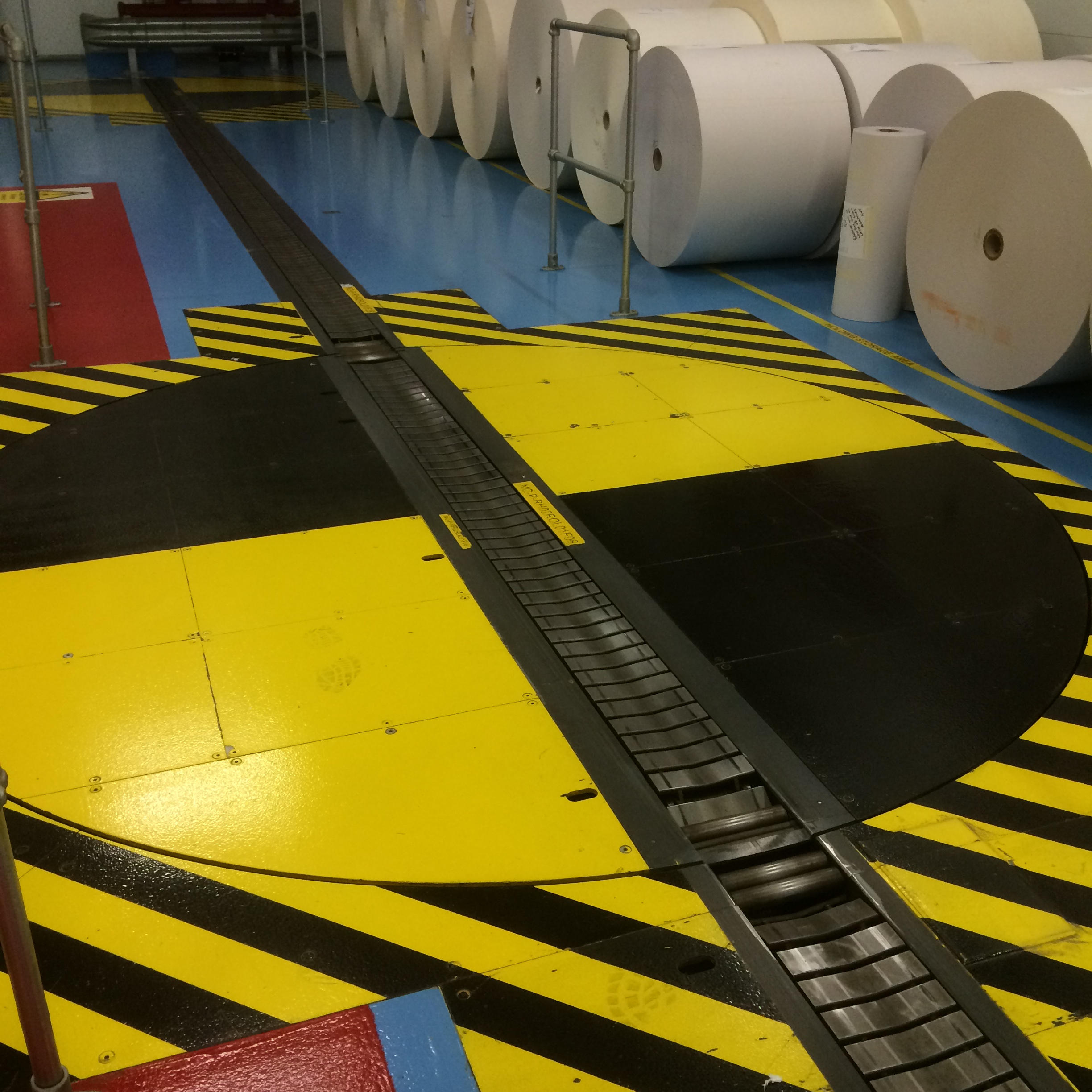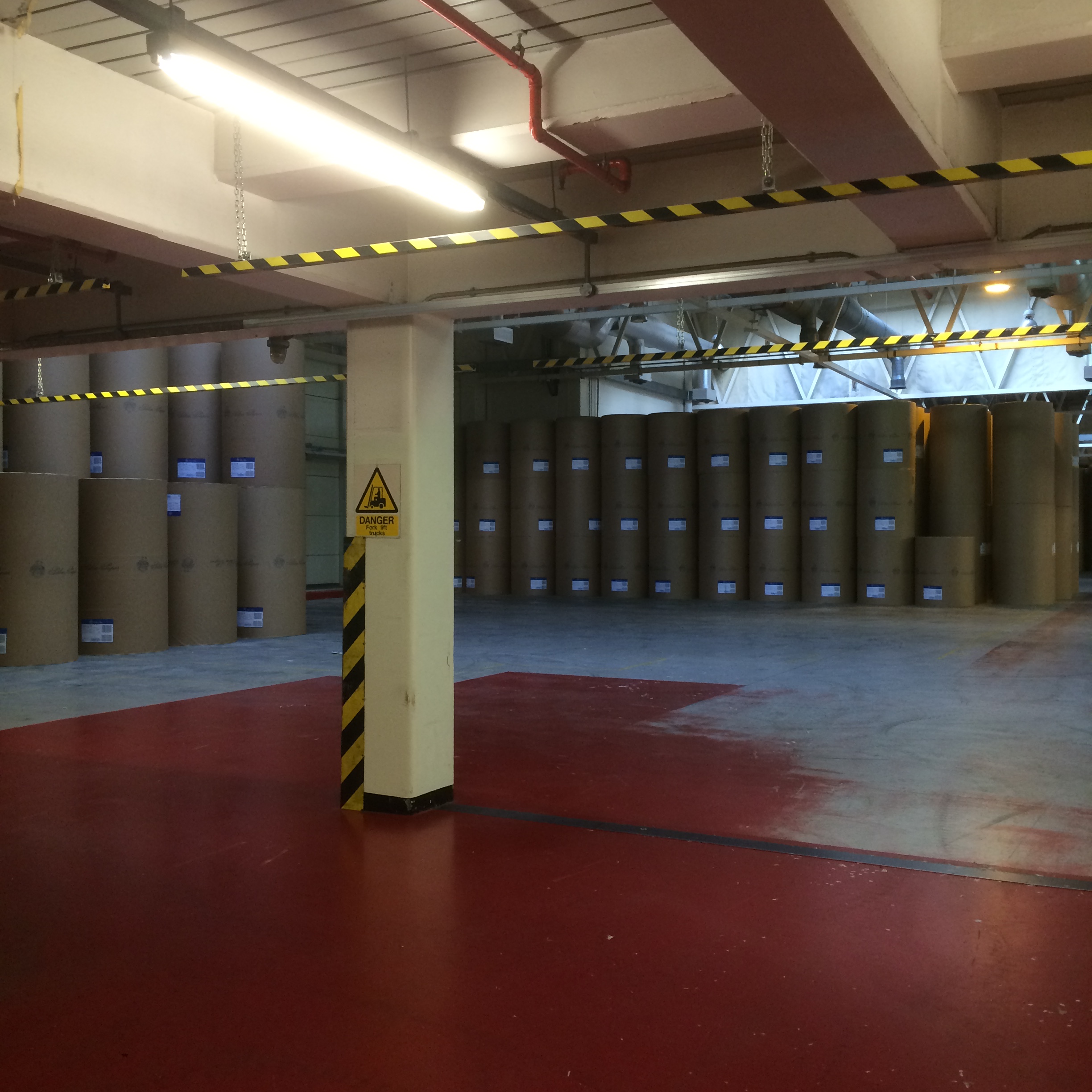 Today’s picture is of the track by which huge rolls of blank newspaper – 2211mm tall by over 1200mm wide and weighing 2 tons – are moved from the storage area into the printing presses before becoming your morning newspaper. Each roll of paper is from recycled paper and costs £1,000.