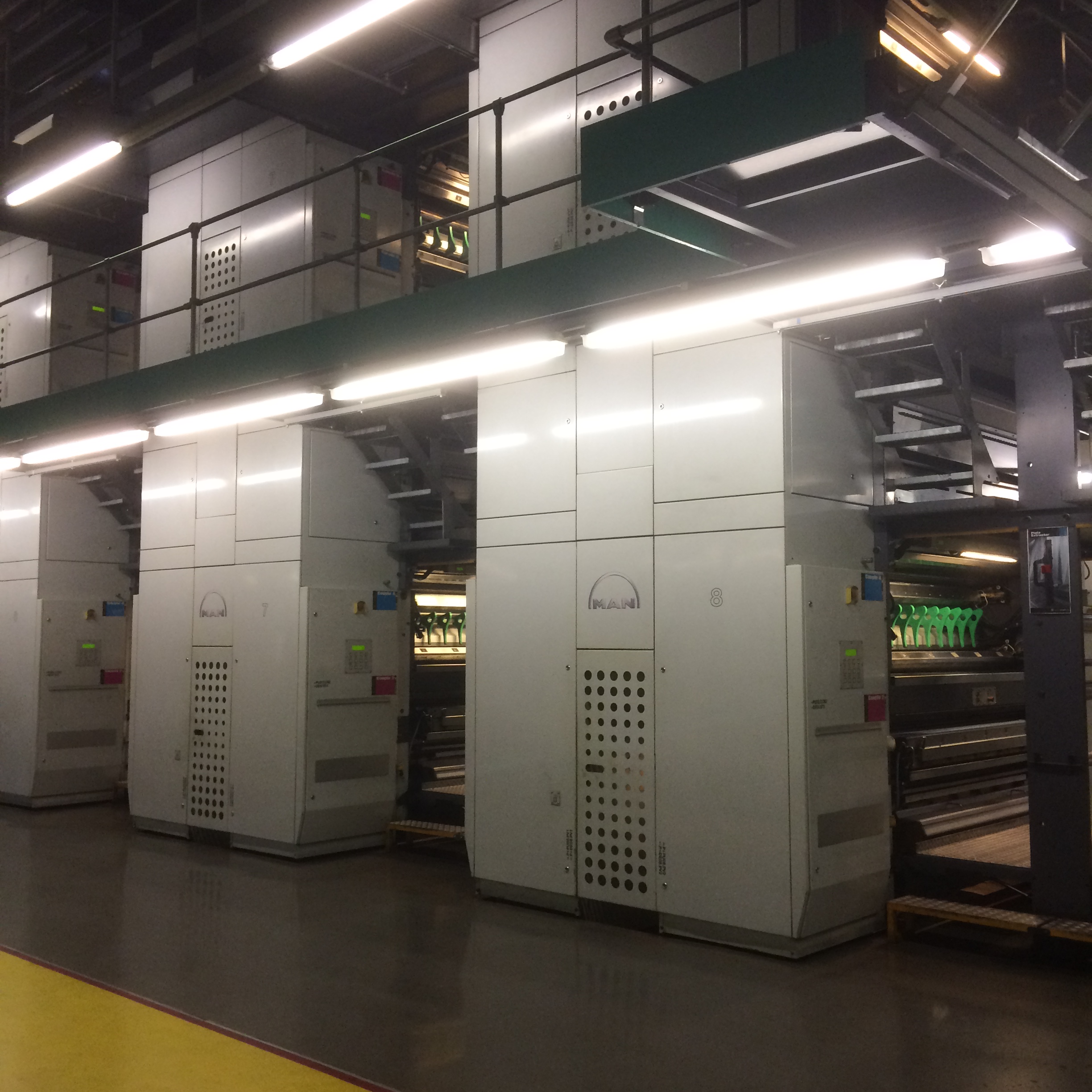 They have five presses that begin to print the national papers at around 2230 each night. This is subject to the various newspaper editors submitting the pages on time and, often, this can be later as a result. Each press is capable of printing up to 86,000 complete papers each hour – 120 pages of a broadsheet and 240 pages for tabloids.