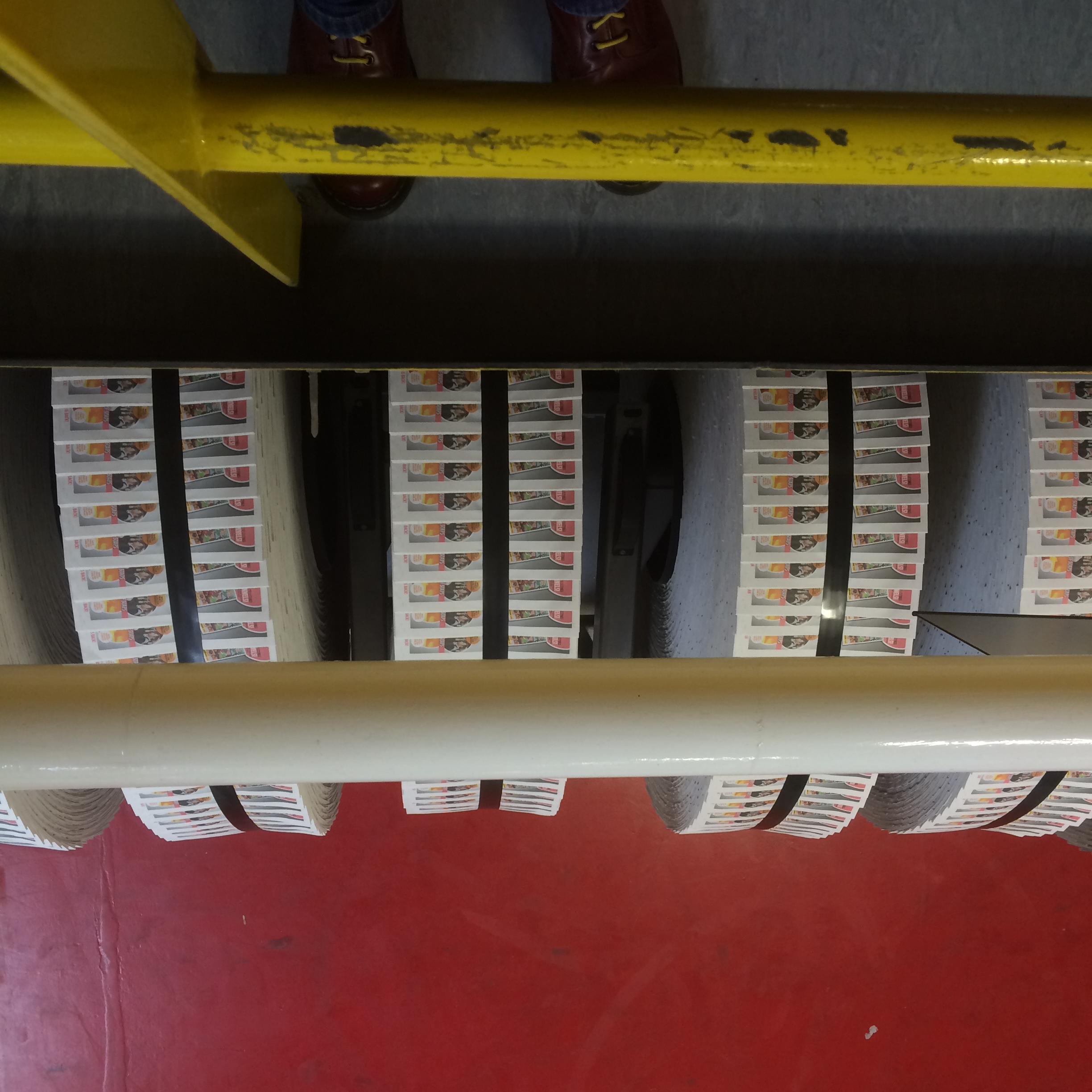The paper shoots through at quite some speed and it was thrilling see the white paper begin to turn into finished newspapers as it whizzed through the operation. At the end, a fully printed, folded and stapled paper comes off at the end. All bound and ready for loading onto wagon to take to distribution centres.