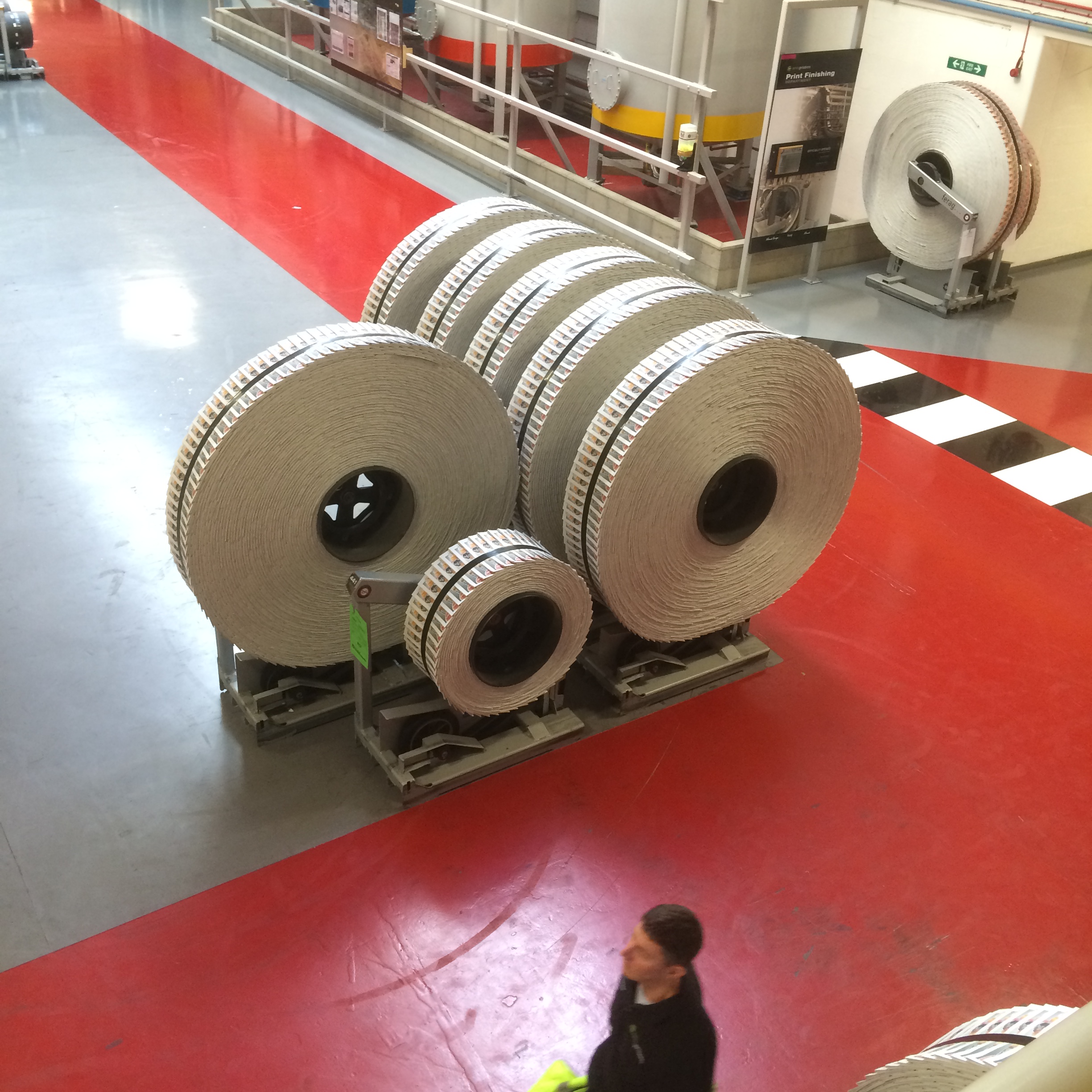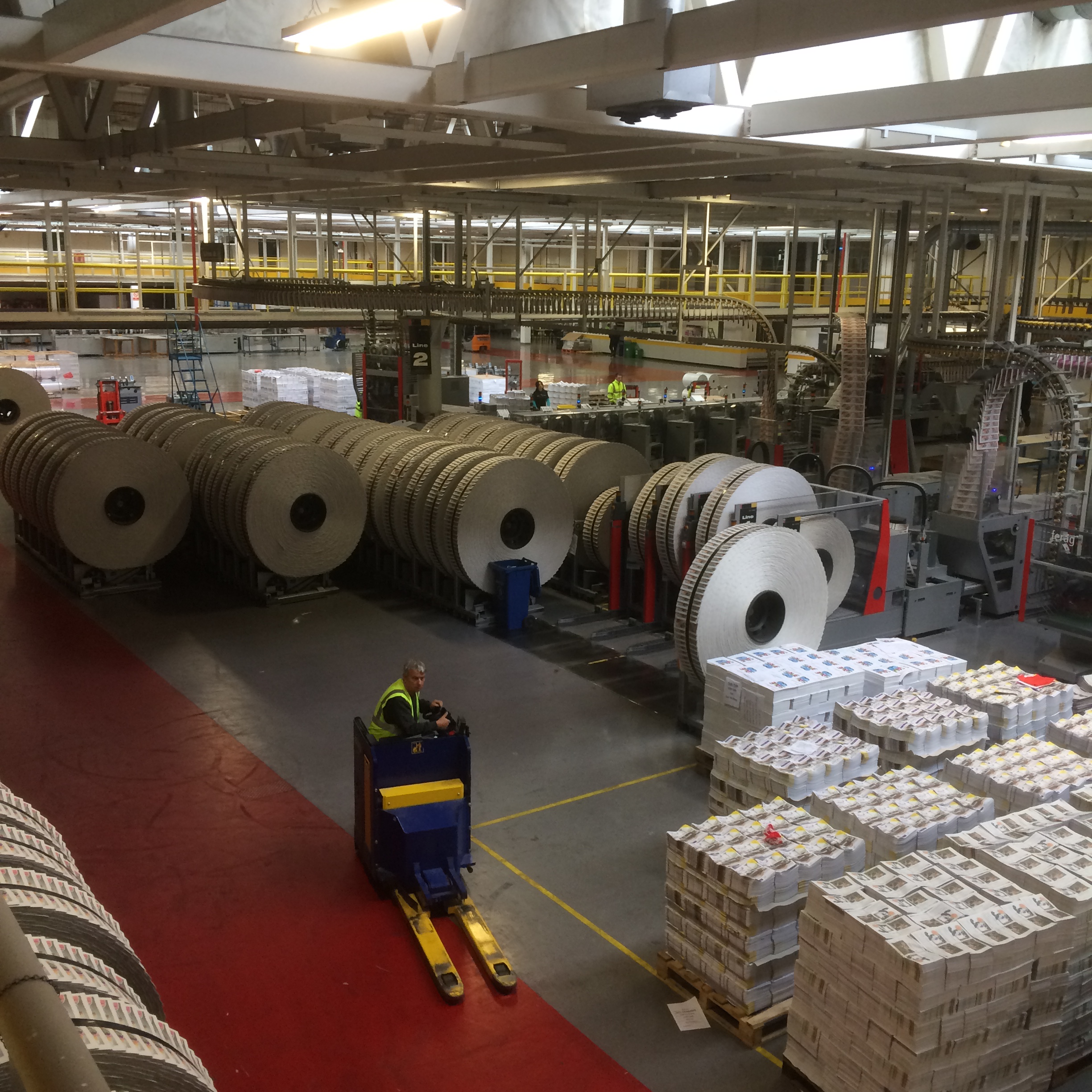 The plates then travel into the printing or where they are go into the presses. Huge, I mean MASSIVE – weighing up to 2 ton each, rolls of paper travel automatically into the presses. Once all is in place, a button is pushed and the presses begin to roll.