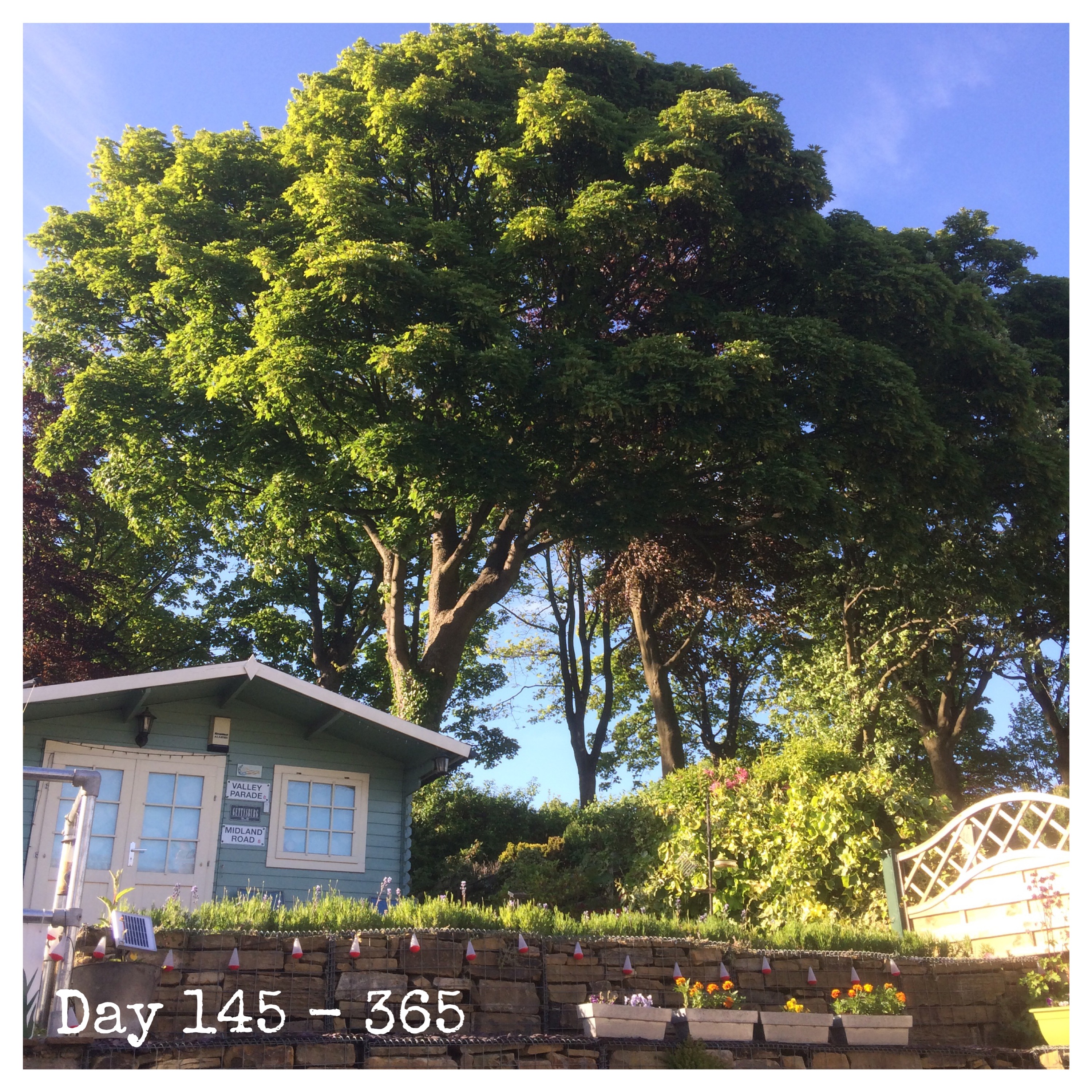 The sunshine and blue sky, combined with the way the tree from the garden behind ours looms over, gives today’s image quite a striking feel. We are lucky to have such a beautiful tree to look out upon, however the leaves it deposits all over my lawn and patio in autumn are a pain to tidy up.
