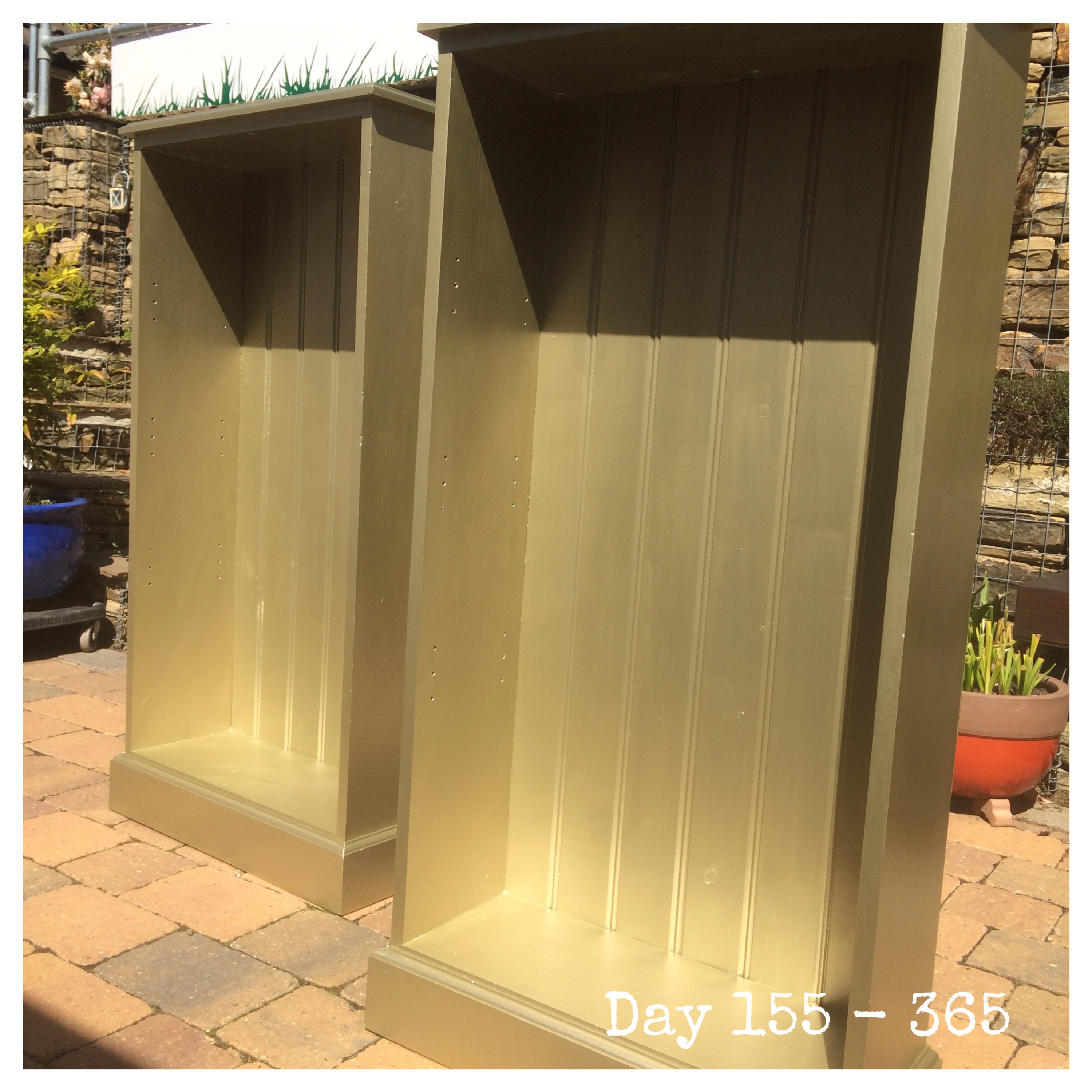 My Midas themed bookcases. Freshly painted and hardening off in the sunshine before beginning their new life in our dining room.