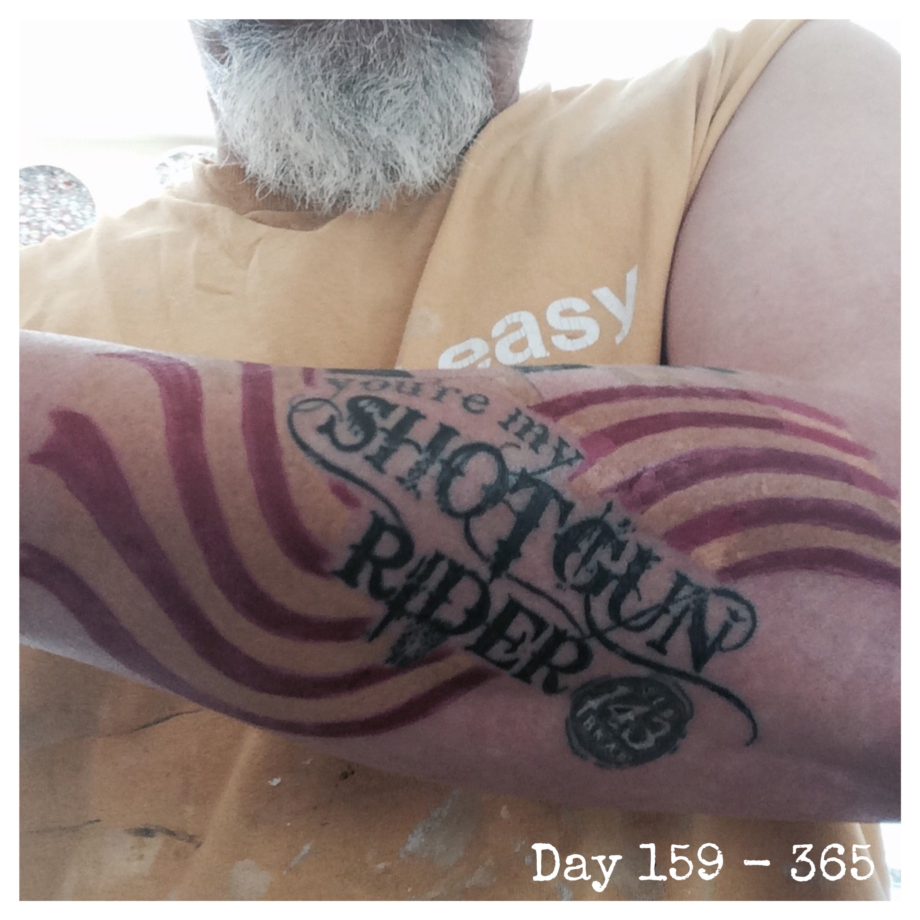 But, the main purpose of today’s image is to show of my recent tattoo. As you’d expect, it is in black and grey with the, quite bold, addition of claret and amber. This is the start of the sleeve for my left arm and will be continued with various passport style stamps that I am currently designing. Each stamp will show my favourite foreign destinations and the dates I visited them. So, as I get old and infirm and my memory goes, I will be able to recall where I’ve been.
