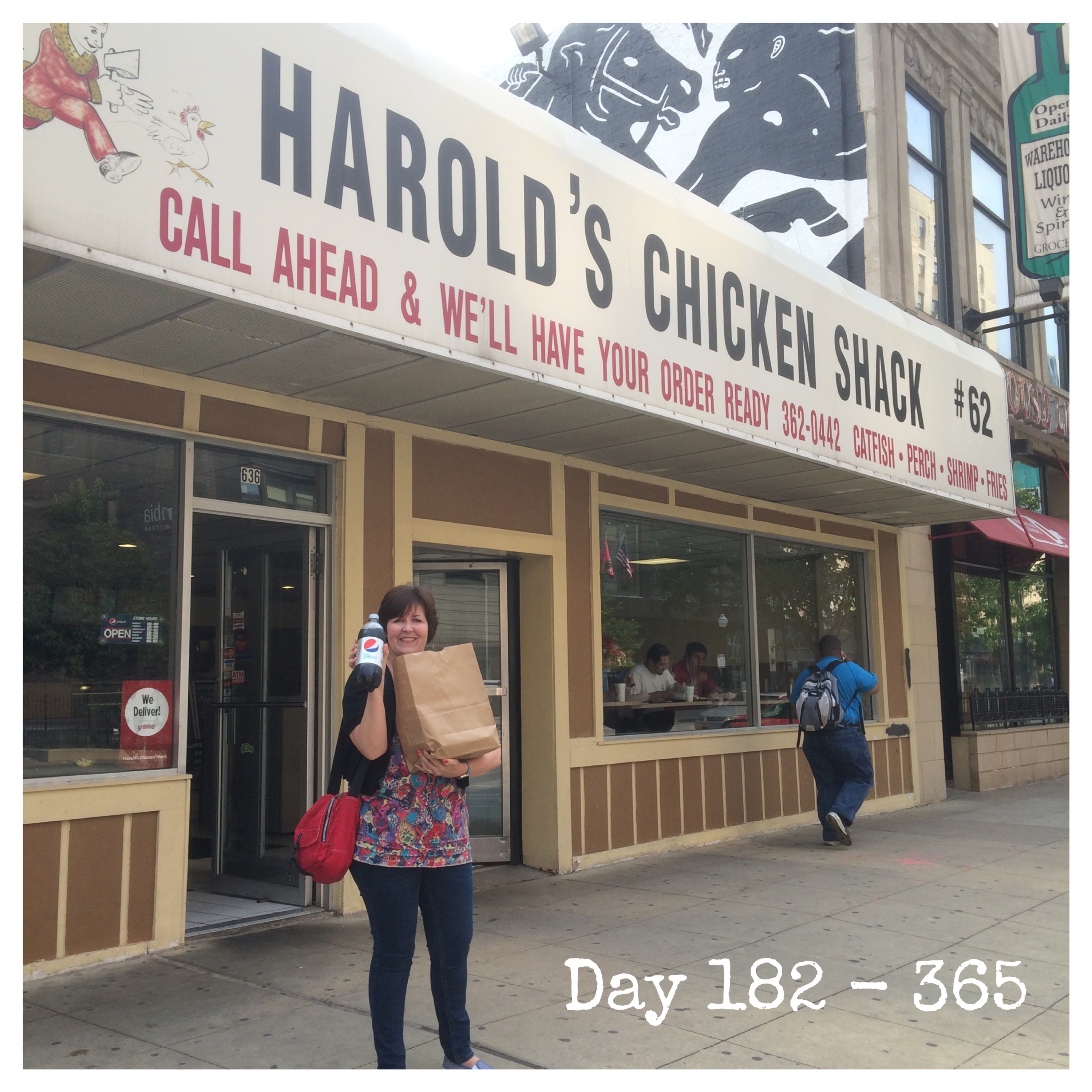 From the windows of the pool we could see the corner of the block to the rear of the hotel where “Harold’s Chicken Shack” was located. After you’ve moseyed around the streets of a new city, clocking up an average of five to six foot miles each day, and swam an additional half mile in the hotel pool (11 lengths if you’re curious, 44 of them equal one mile according to the sign poolside), then you get a tad peckish.