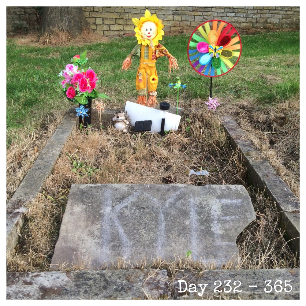 I have bee intrigued by this grave for a little while. It is slightly shorter than the usual some of a grave and the brightly coloured decorations, the flowers, scarecrow and windmill, lend it a jolly appearance. Well, as jolly as a grave can be. Especially when you think that it is likely to be child’s grave due to the size and the additions.