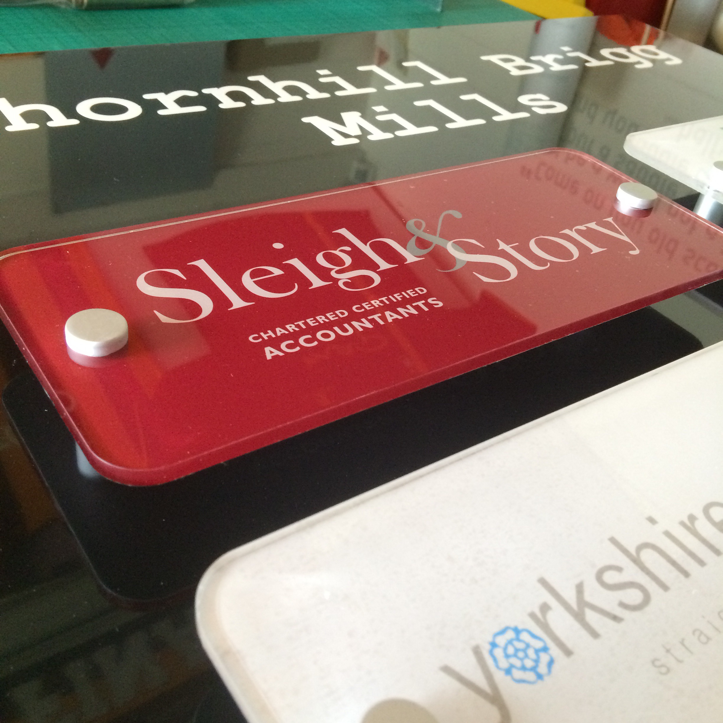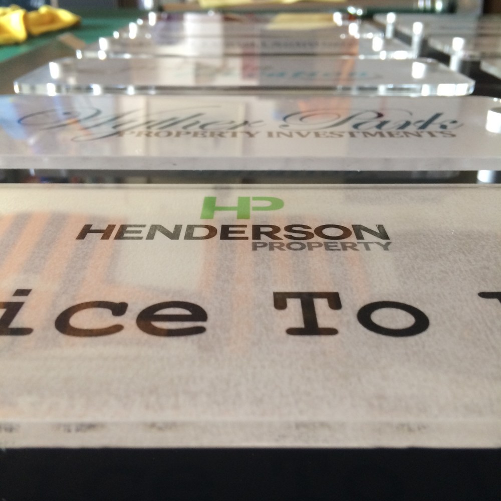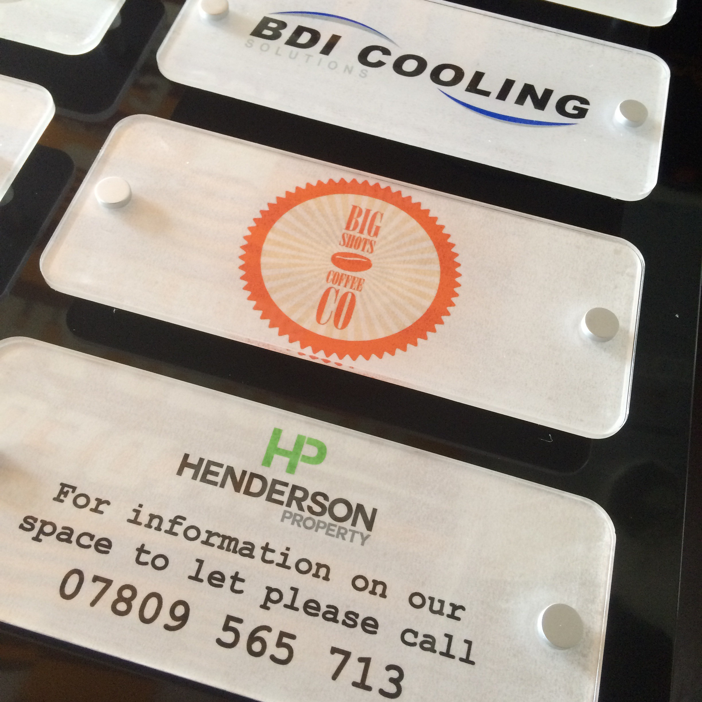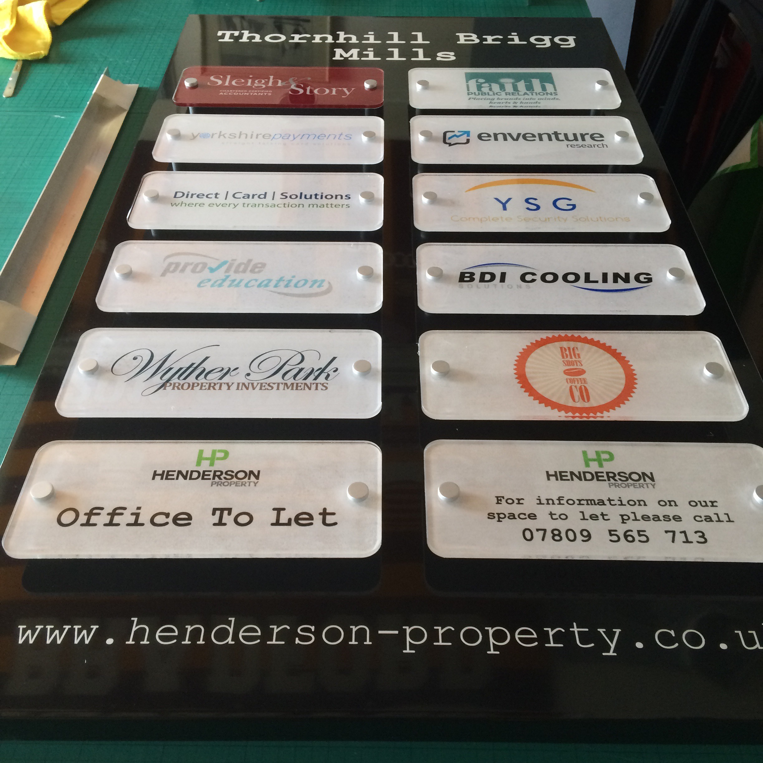 As you may be able to see from the images, it is a directory style sign with individual, replaceable plaques for each client. The plaques are made from 5mm clear acrylic with graphics to the rear and are fixed to a “tray” style back panel using “stand-off” fittings that raise each plaque off the background surface and allow swift and easily changing of names.