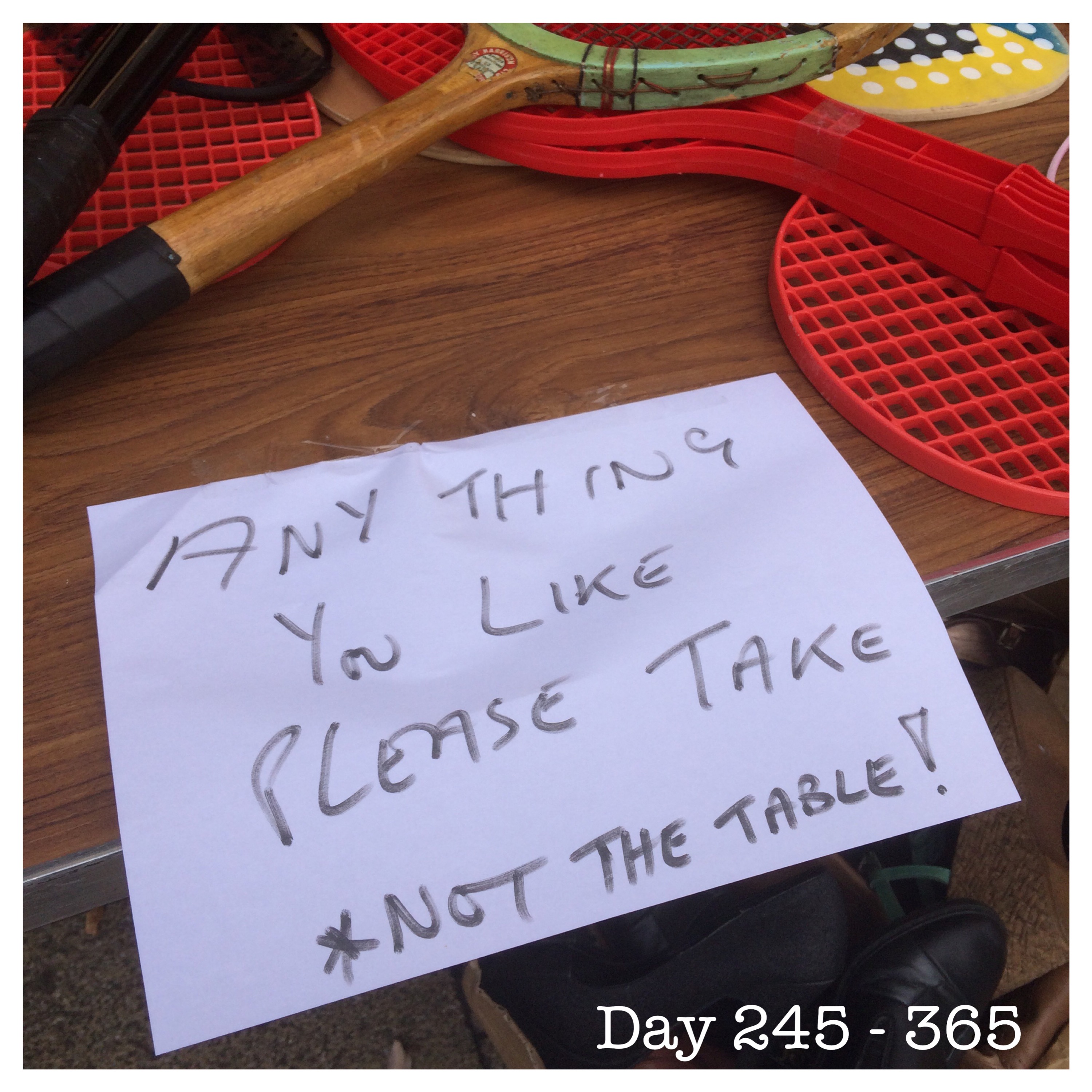 A hand written sign on a table full of, let’s be honest, crap, outside a local charity shop.