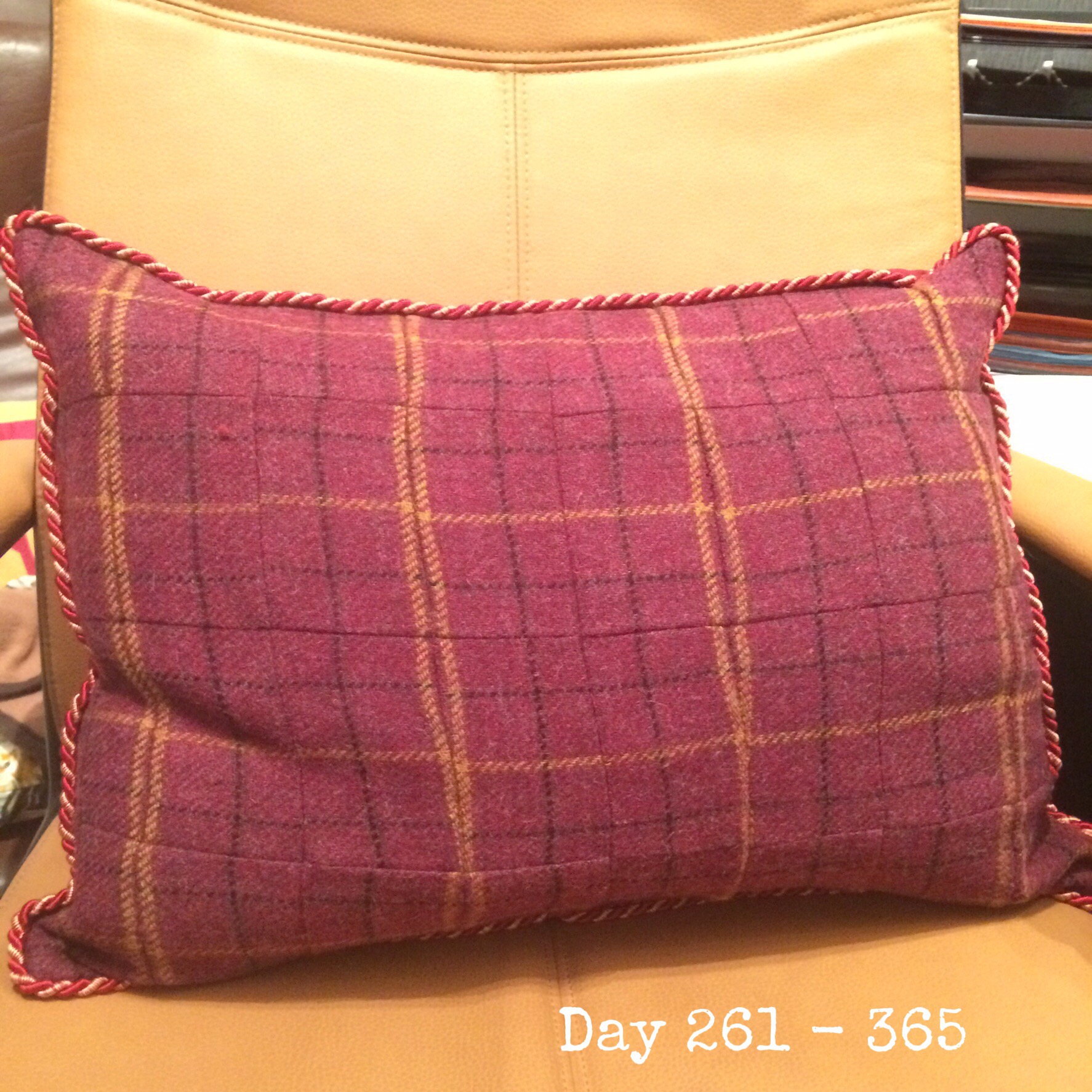 A cushion made by my mother in law out of the small pieces of “waste” from our tweed.