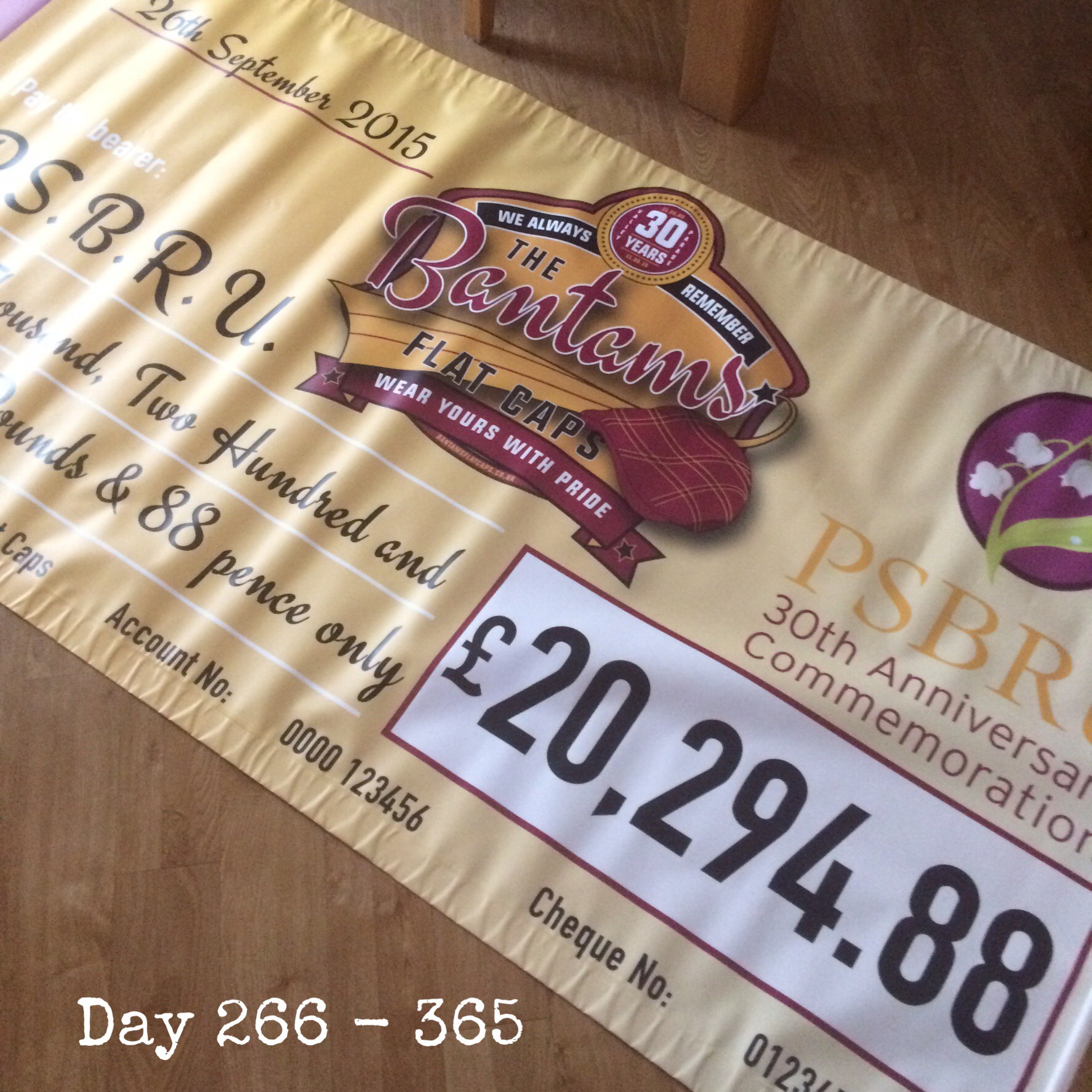 Jeremy, Liz and I are presenting a cheque to the PSBRU on Saturday before the game at Valley Parade. I have designed and produced a large “cheque” to hand over.