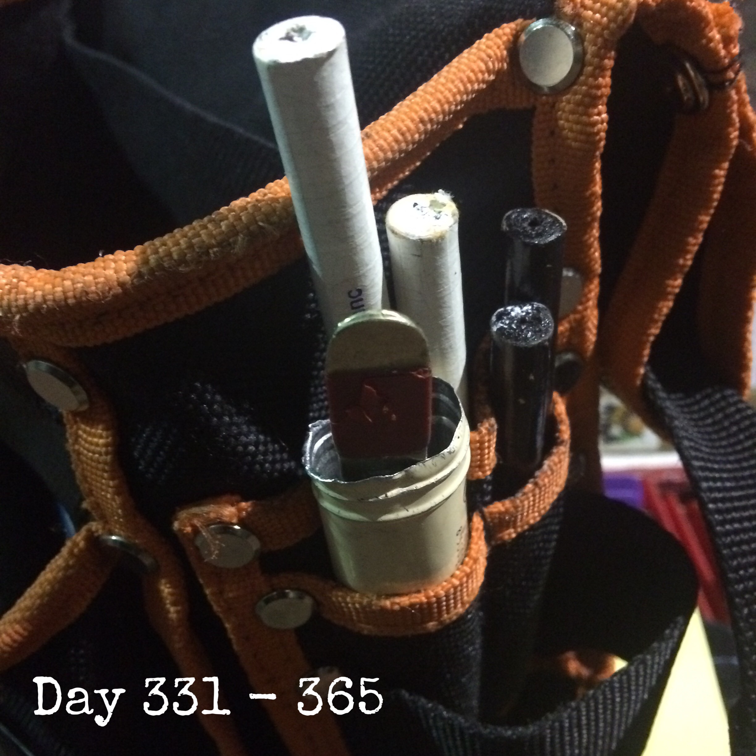 This is my “Bat Belt”. It is a rigid canvas belt with various pockets and compartments in which I put my squeegees, Chinagraph pencils, tape measures and whatnots. Through previous painful experience, I keep one pocket lined with an old cigar case into which my scalp goes. the tin aluminium case prevent the surgical blade from slicing through the belt and into my calf.