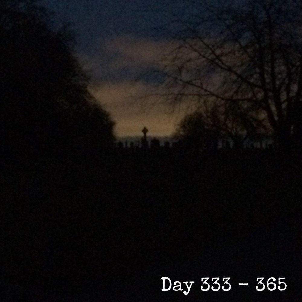 A spooky shot of the cemetery in which we walk the mutts each day. Lovely in the daylight but menacing as darkness falls.