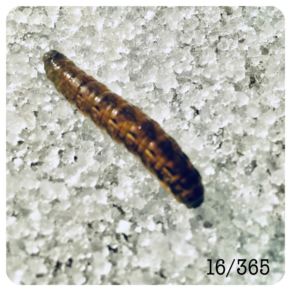 I had to pop out into the snow to retrieve an item from my workshop late tonight and came across this critter as he crawled over the ice. If pretty sure that a caterpillar moving over an icy path isn’t that common.