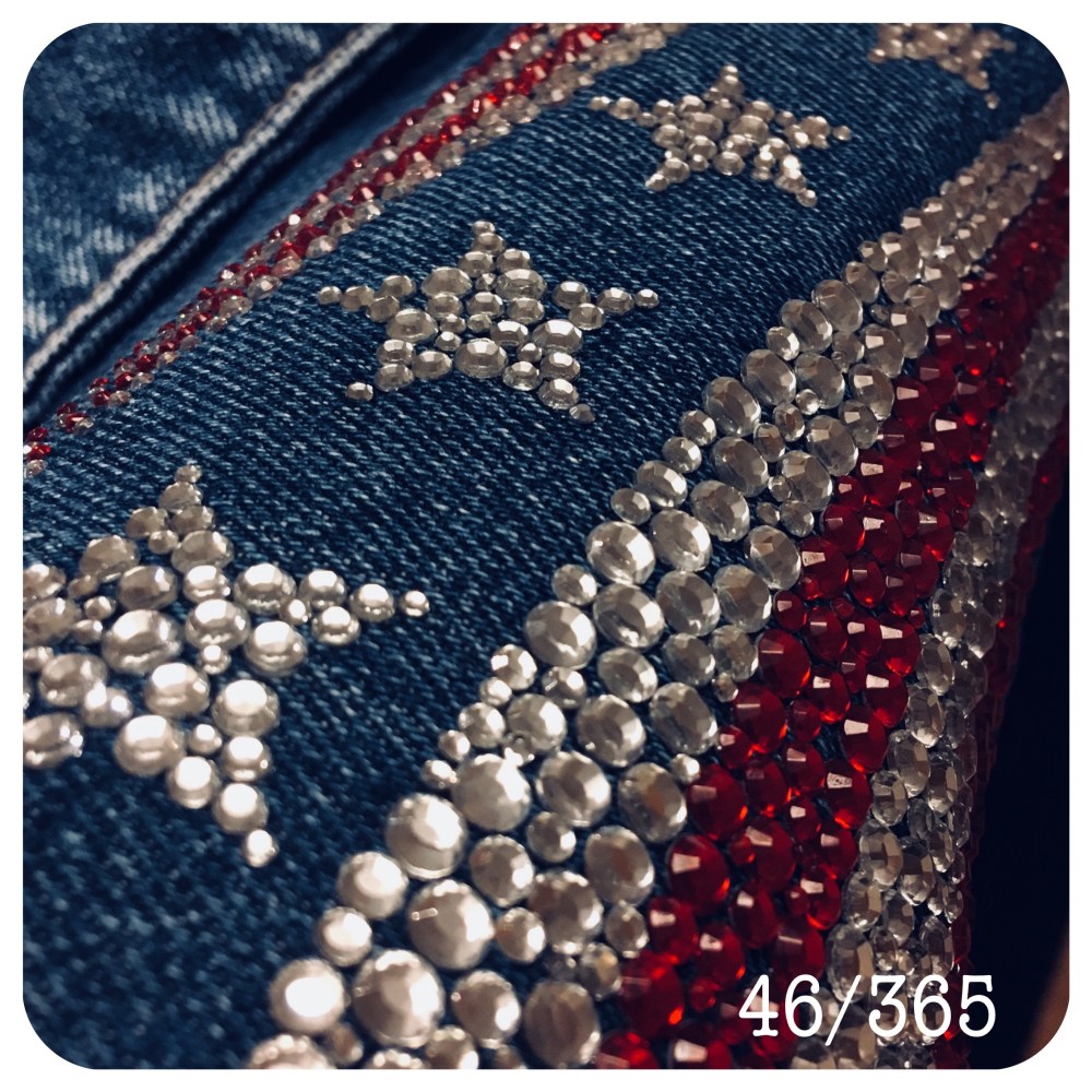 More embellishments on Sarah’s denim jacket ahead of Country 2 Country. This is a “Stars and Stripes” affect across the shoulders.