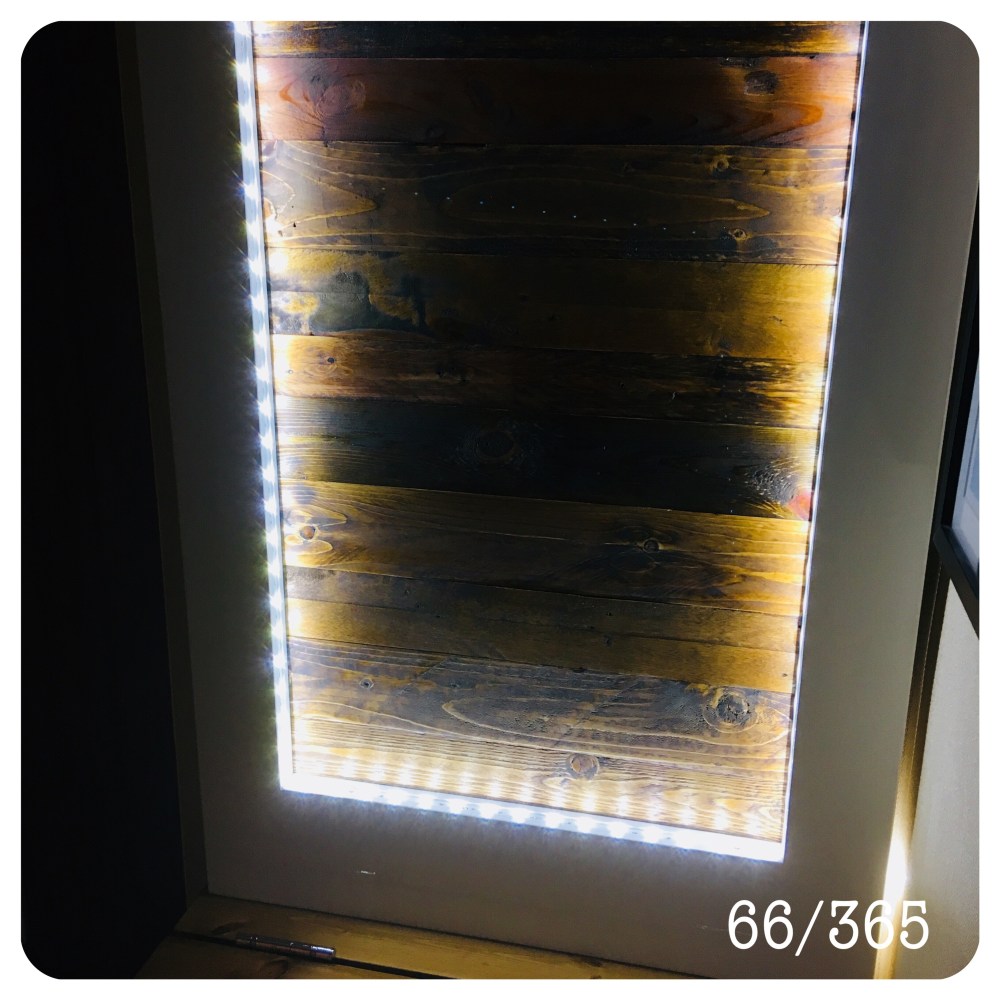 The hall tree / seat / storage thing that I have been working on is now in situ. I think the reclaimed timber works well alongside the new, gloss plained wood and with the LED lights.