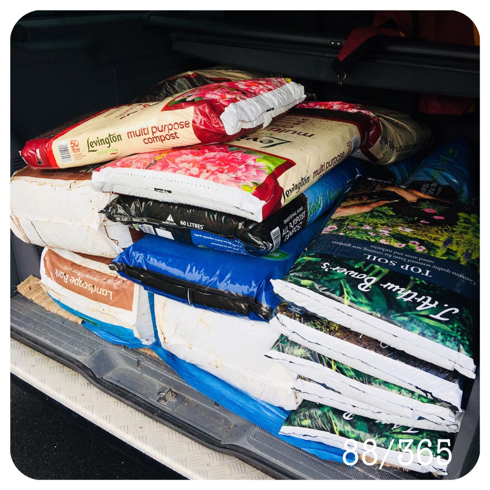 A trip to the garden centre with my daughter today. In total we bought twenty bags of compost, soil and composed landscaping bark. So much so that I was a tad worried my van might not be able to move with them all in.