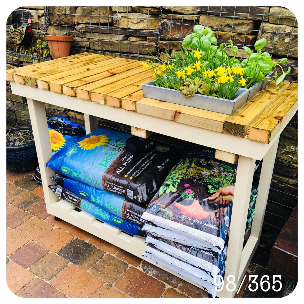 My newly built potting bench is complete and some daffodils and new basil plants look happy enough on it.